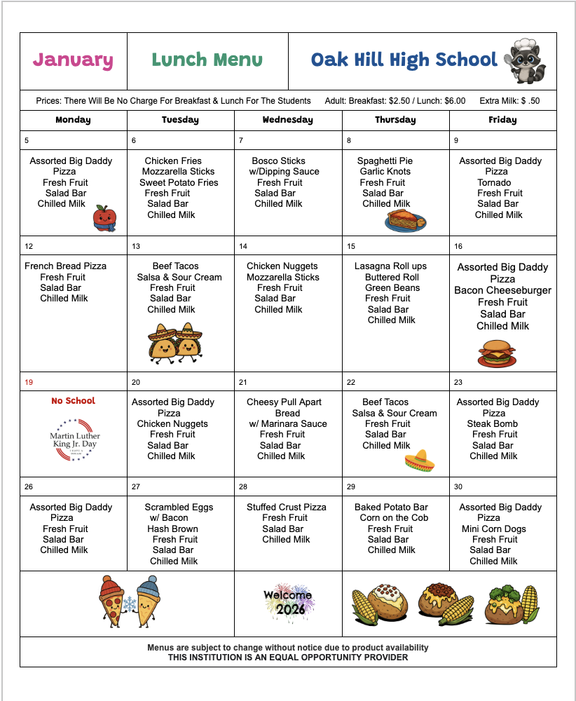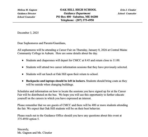 Sophomores - Just a reminder that all sophomores will be attending the Career Fair at CMCC on Thursday, January 8th. The field trip will depart Oak Hill at 8:45 and return by 11:15. Students will eat lunch upon their arrival back at school.