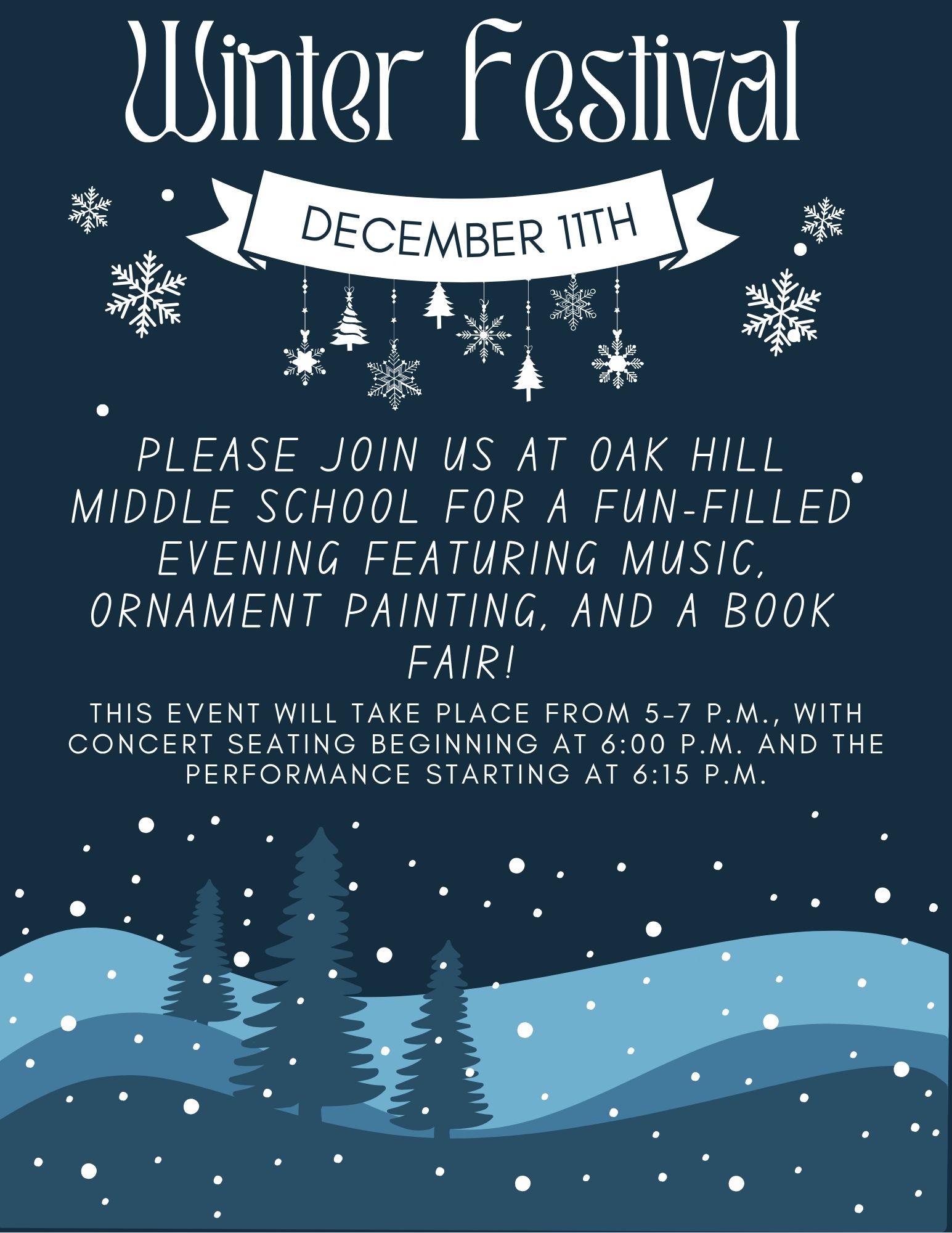 We are thrilled to invite all families to our Winter Festival on Thursday, December 11th from 5:00–7:00 PM here at Oak Hill Middle School! This is always a joyful community event, and we hope to see you there.